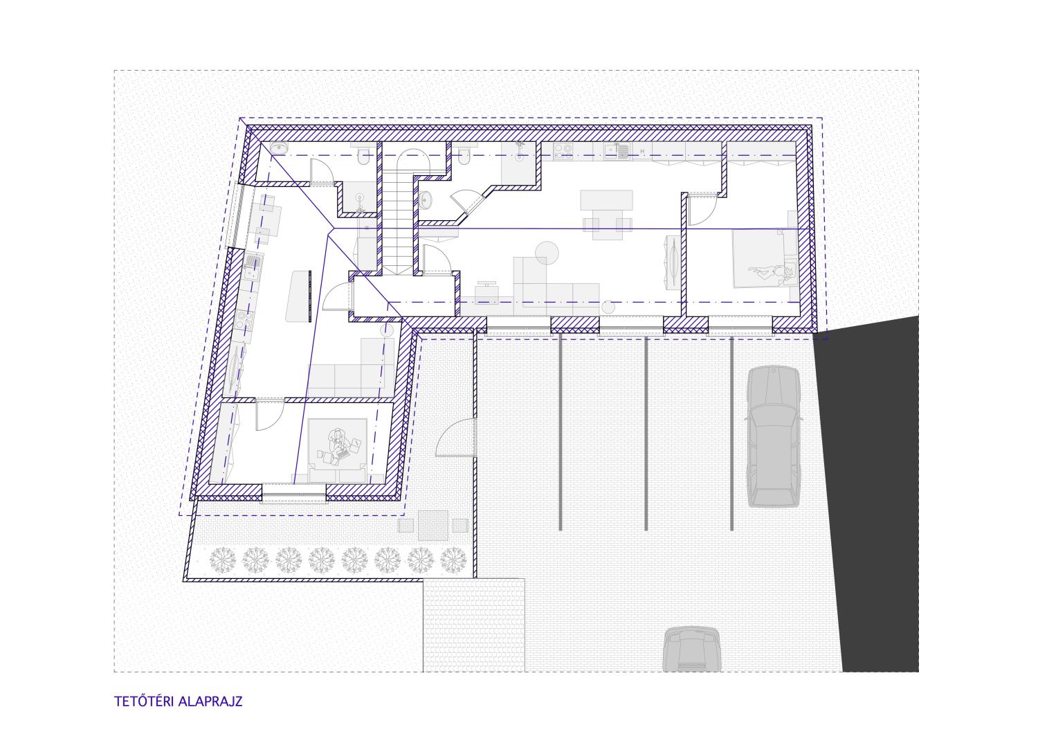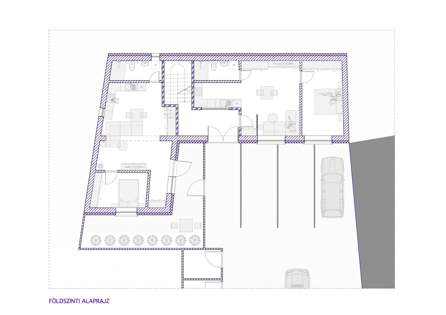 Az épület a telek belsejében helyezkedik el, távolabb a forgalmas úttól, ami lehetővé tette, hogy kifejezetten csendes, intim lakótereket alakítsunk ki. Ez a környezeti adottság meghatározó szempont volt a lakások elrendezésénél és a nyílászárók tájolásánál is.